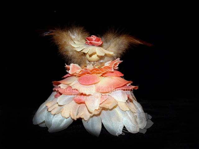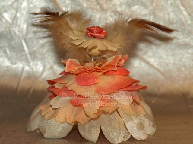 Kate is pure and clean. She is a great hostess when it's time for tea. Always making sure that everyones teacup is full to the brim. Her dress is made of almost translucent white petals accentuated with layers upon layers of peach coloured leaves. She has the finest feathered wing and a salmon coloured silk rose sits upon her head. Faerie Kate stands approximately 3" tall from the bottoms of her curled toes to the tips of her feathery wings.