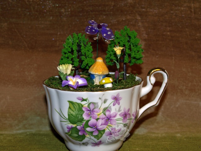 This dainty Teacup Nursery welcomes Windsor home each evening. A round small hut can be seen between the two over towering green trees. There is a yellow mulberry flower tucked along side a purple and white fimo flower. There is a small clay purple rose beside the yellow topped mushroom that matches the tall yellow daffodil. And if you look closely enough, you just might sneak a peek and find the dark brown bunny hiding in the trees.