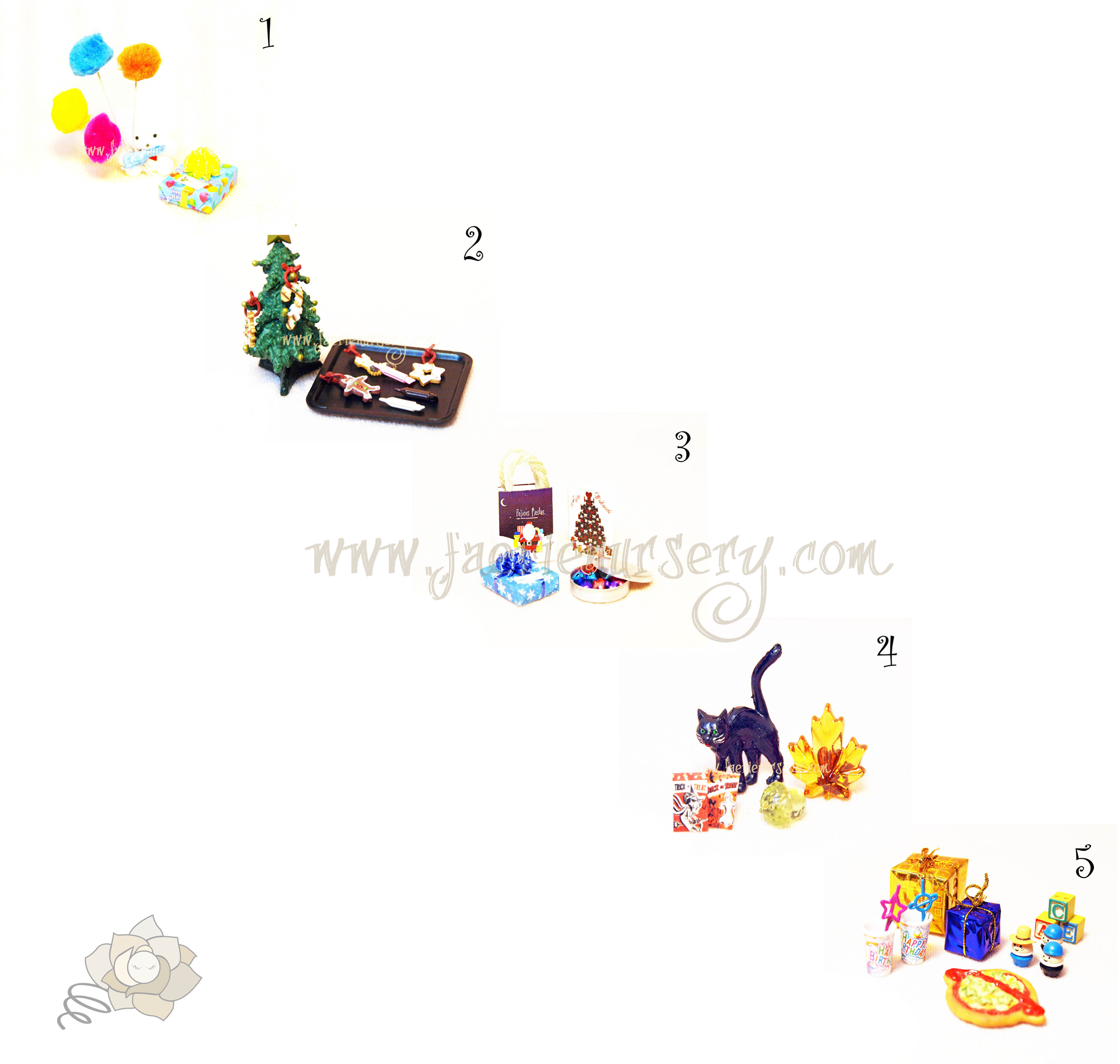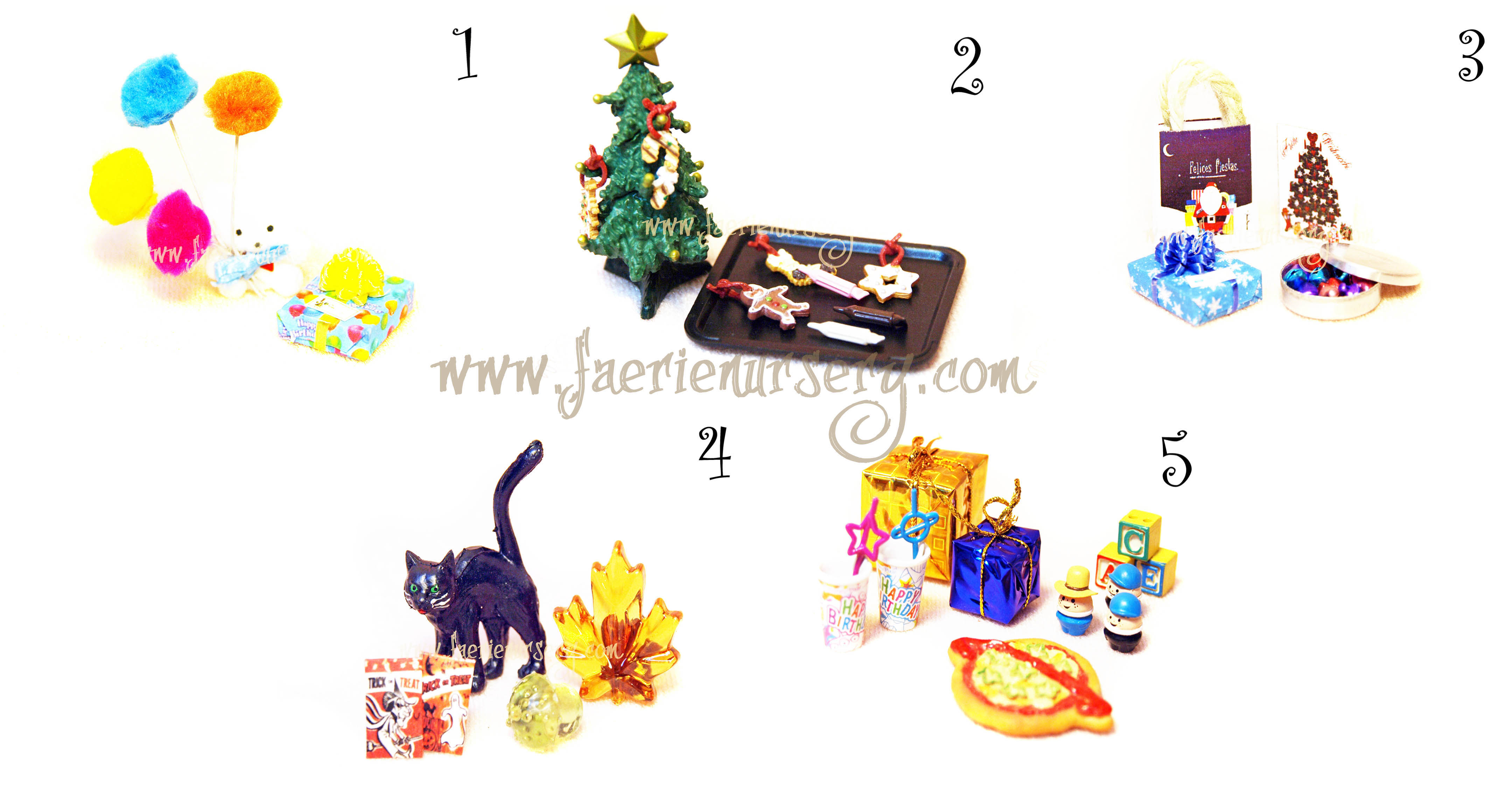 5------ IN STOCK ~~ It's party time! With friends gathered close a hand a birthday party wouldn't be complete without a pizza, paper cups with straws, shiny wrapped presents and toys, toys, toys everywhere. Item includes 1 resin pizza (brown, red, yellow, green), 2 plastic cups (multi), 2 plastic straws (random), 2 presents (random, empty), 1 set blocks (random) and 3 resin toys (random) (LOOSE PIECES).