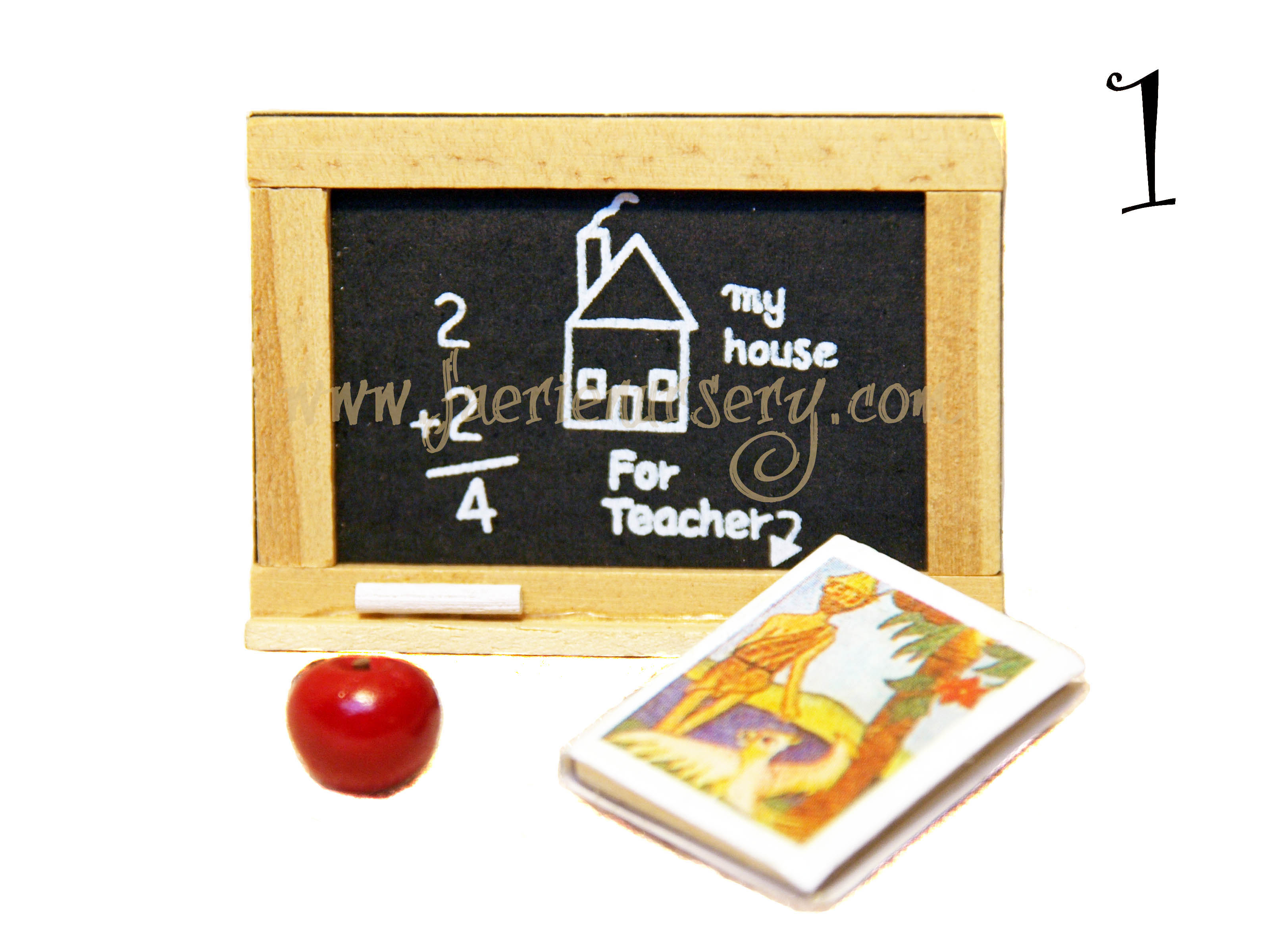 1------ IN STOCK ~~ The lesson of the day has be scribbled on a chalk board for all to see. An apple for the teacher and a book to take home to read. Set includes 1 wooden chalkboard (random words), 1 piece of chalk and/or brush eraser (item(s) are glued), 1 modelling clay apple (random), 1 book (random). (LOOSE ITEMS)