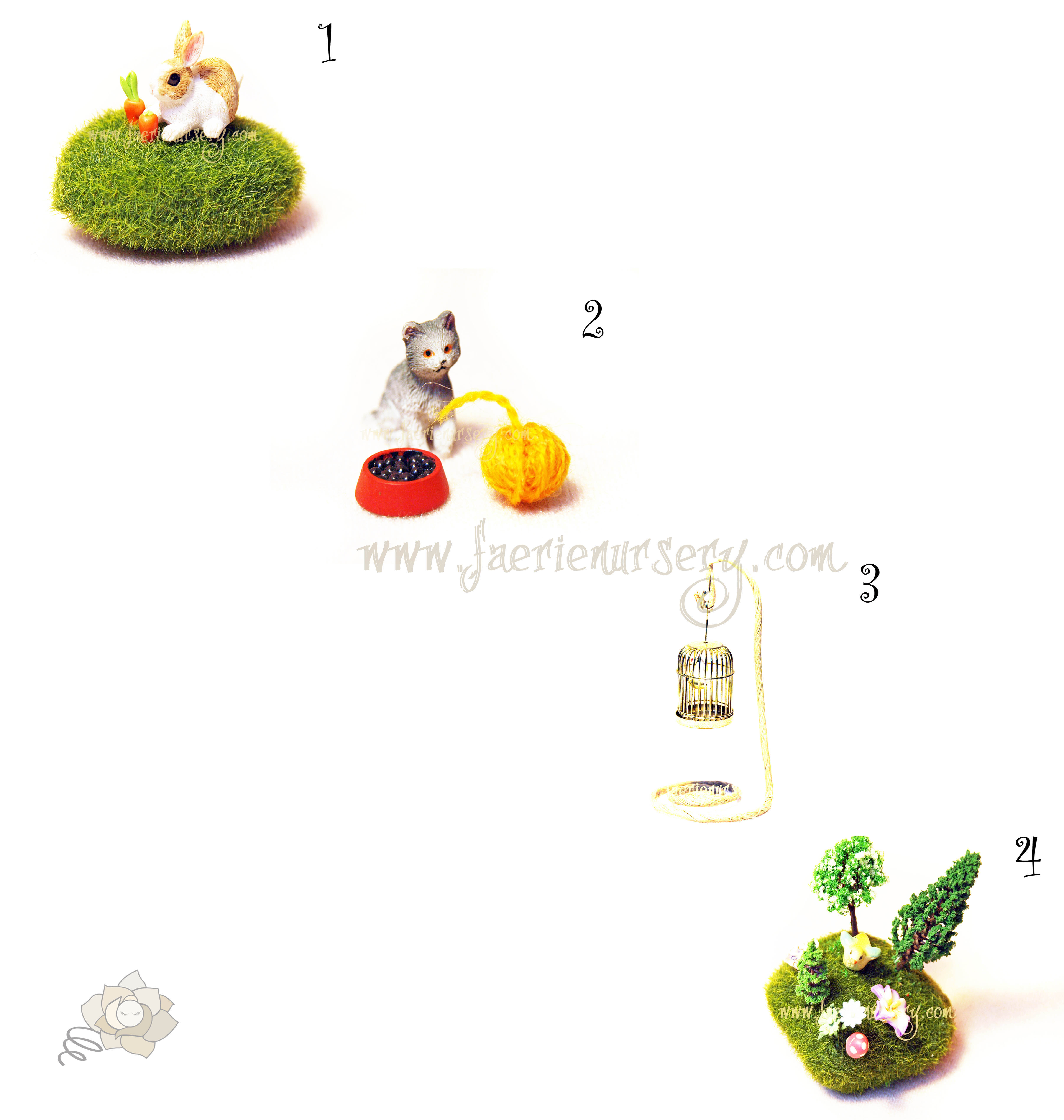 1------ IN STOCK ~~ Sitting on a bed of grass with two carrot tops can be seen poking through, it is here that it has been told, if you keep very very quiet, you just might catch a glimpse at who is eating all of the green coloured carrot tops. Item includes 1 artificial moss ball covered in finely cut plastic grass, 2 carrots made of Fimo (1 carrot top has been snapped off) and a plastic rabbit (random colours)