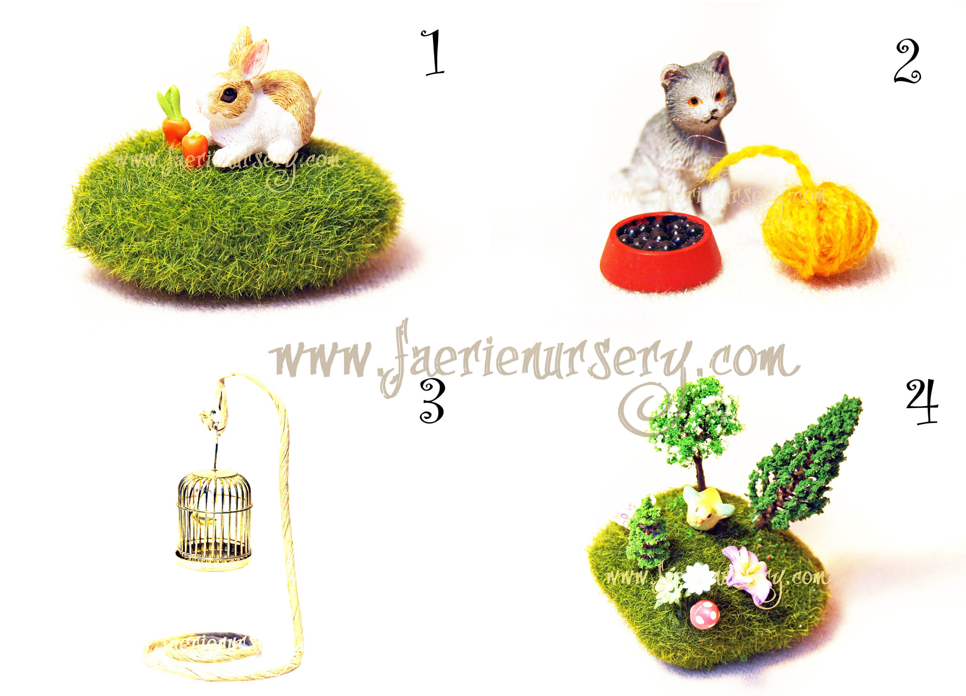 4------ IN STOCK ~~ Found at the bottom of each garden is a tiny greenhouse that cradles little oasis bundles that can be taken home when visitors pop in to see the pretty flowers and dark, dark greens. Item includes 1 artificial moss ball covered in finally cut plastic grass, 3 diorama trees (random colours, size and shapes), 1 porcelain bird (random colours and shapes), 2 mulberry flowers (random colours, shapes and size), 1 Fimo toadstool (rand colour and size) and 2 Fimo flower heads (random colours and size).