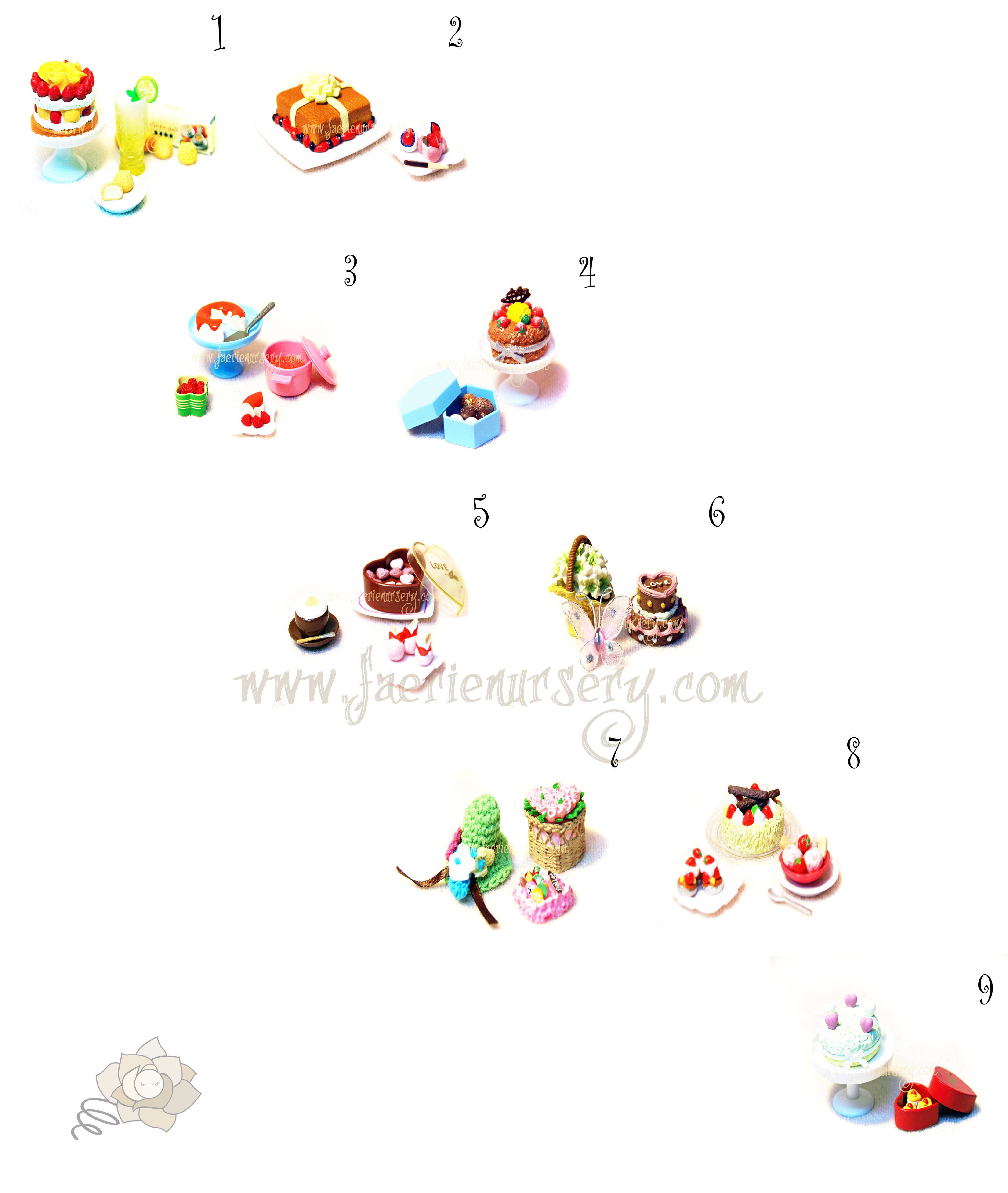 1------ IN STOCK ~~ Cooling off in the heat of warm summer's day with a tall glass filled with frothy lemonade garnished with a slice of lime and mint. Anyone with a sweet tooth will definitely love this strawberry with cream cheese on both the middle and top. Little cakes in their own cute box that can be places on a plate, but be careful, it looks like one of the Faeries just might have taken a wee bite out of one. Item includes 1 plastic cake (brown, white, yellow and red), 1 plastic pedestal (white), 1 paper box (yellow), 5 plastic mini cakes (yellow), 1 plastic half mini cake (brown and white), 1 plastic plate (white), 1 plastic glass (transparent), 1 plastic lemonade insert (yellow and white), 1 plastic lime slice (green) and 1 plastic mint leaf (green) (loose pieces).