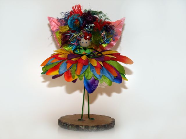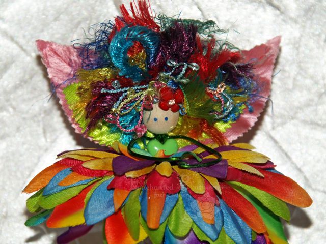 Aurora stands just over 5" in height. She has a green metallic wired body with a heart shaped pony bead as a bodice. Her dress is made from 11 layers of silk flower petals in the colours of the Aurora Borealis (Northern Lights). Her hair is a mixture of speciality yarns and a shiny metallic flower shaped bead. She has double leafed faerie wings.