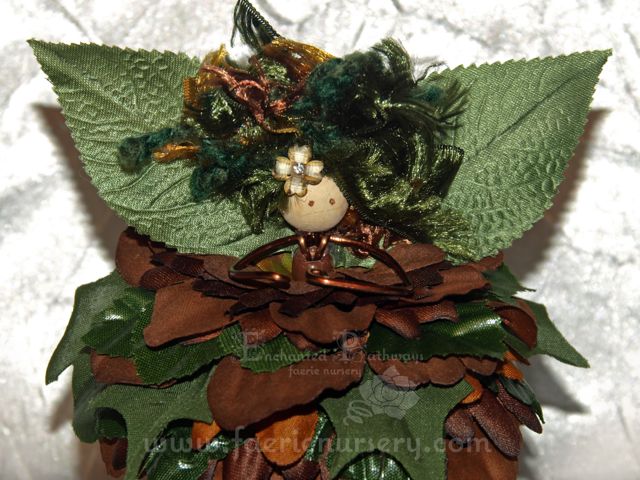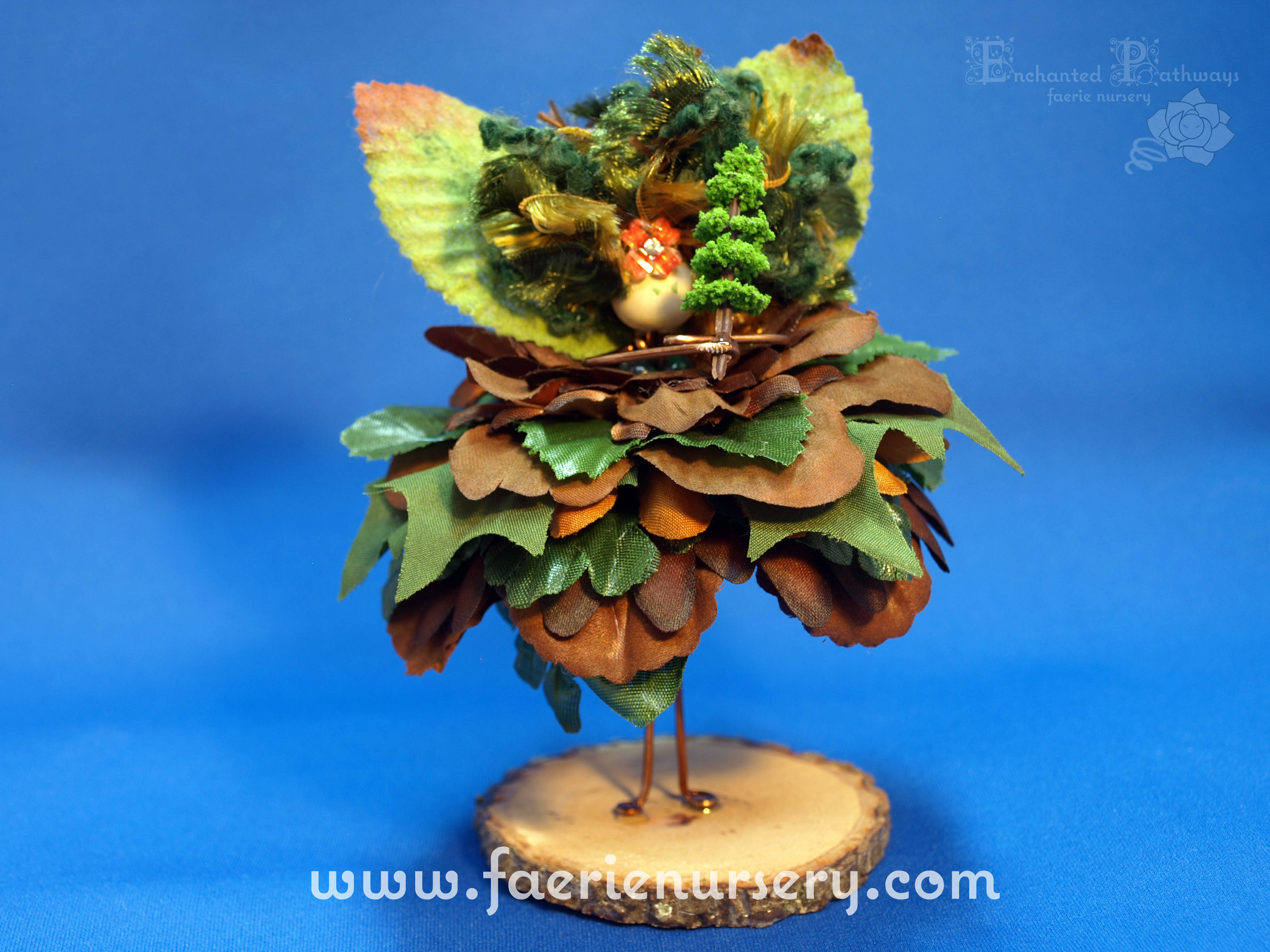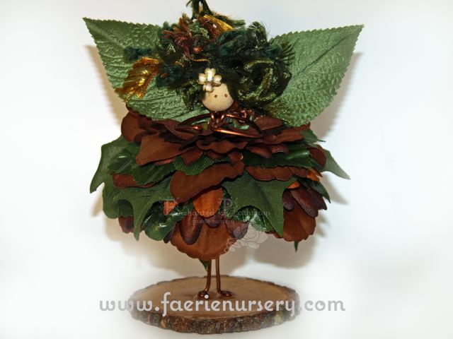 Boreal stands just over 5" in height. She has a brown metallic wired body with a brown pony bead as a bodice. Her dress is made from 20 layers of silk flower petals in the colours our northern forests. Her hair is a mixture of speciality yarns and a shiny metallic flower shaped bead. She has leaf faerie wings.