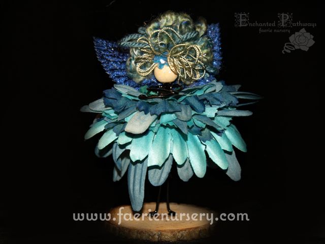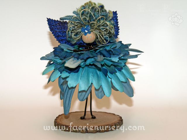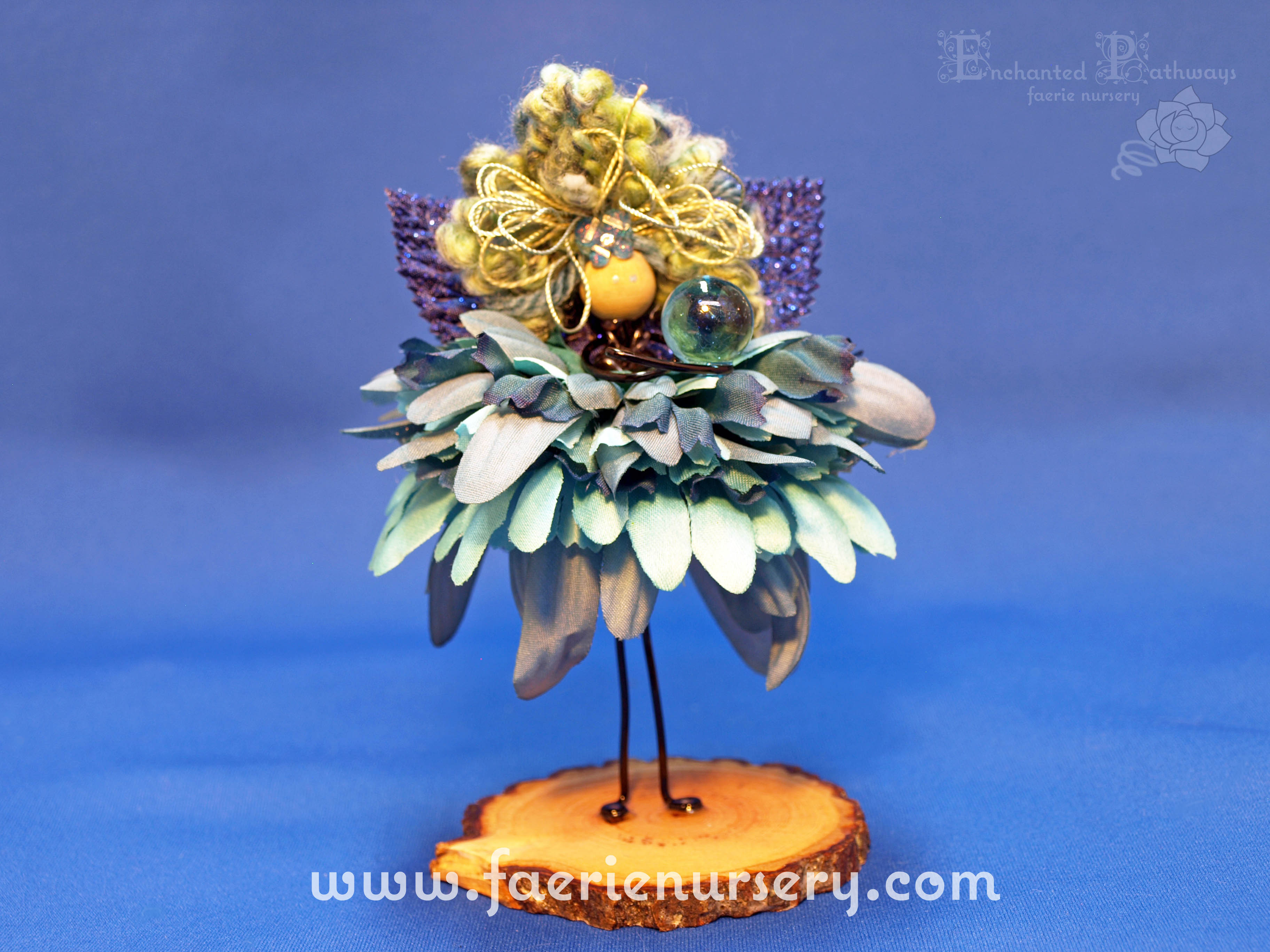 Agua stands just over 5” in height. She has a blue metallic wired body with a translucent heart shaped pony bead as a bodice. Her dress is made from 11 layers of silk flower petals in the colours of blues found in the deepest lakes to the turquoises found in the shallowest streams. Her hair is a mixture of specialty yarns, metallic cotton flosses and has a shiny flower shaped bead. She has leaf faeries wings.