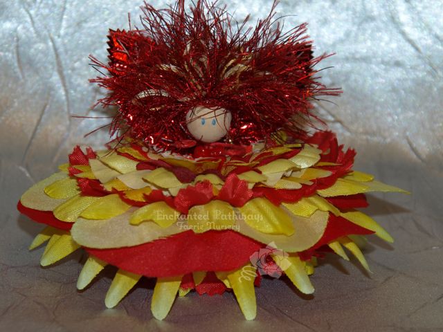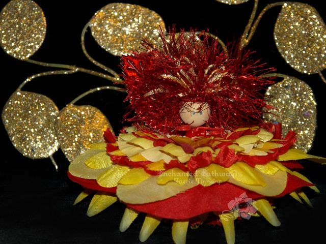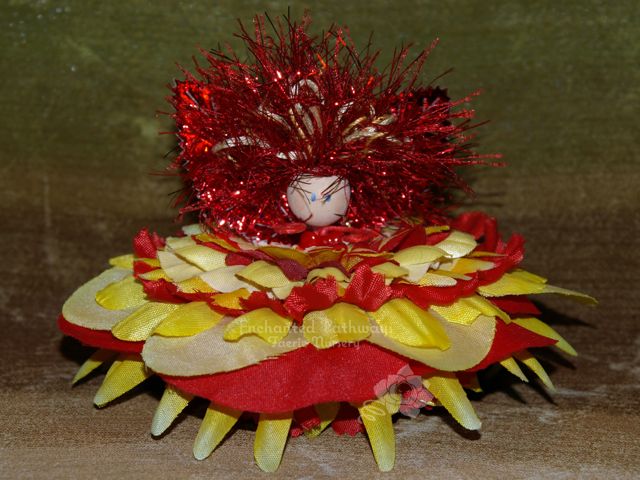 Suditi stands just under 4" tall when you count in her wild hair! Her gown is made up of 22 layers of silk flower petals in shades of reds and yellows. Her bodice is made of 3 interlocking red beads and her body is cotton wrapped wire in red. She wears red faceted beads and bright gold flower sequins for shoes. She has puffy red fabric leaf shaped shiny wings. Her hair is a combination of gold floss and festive red sparkle yarn.