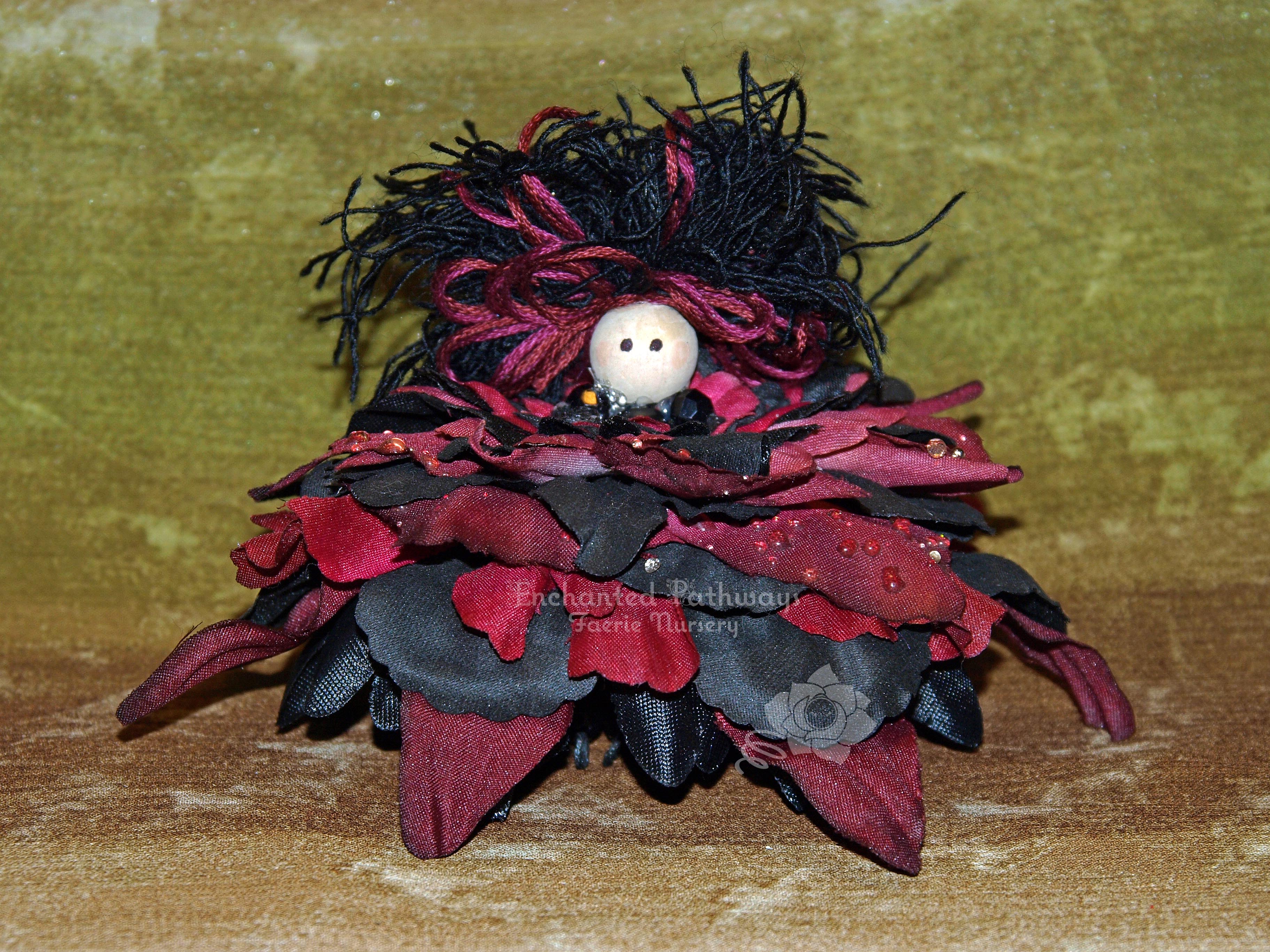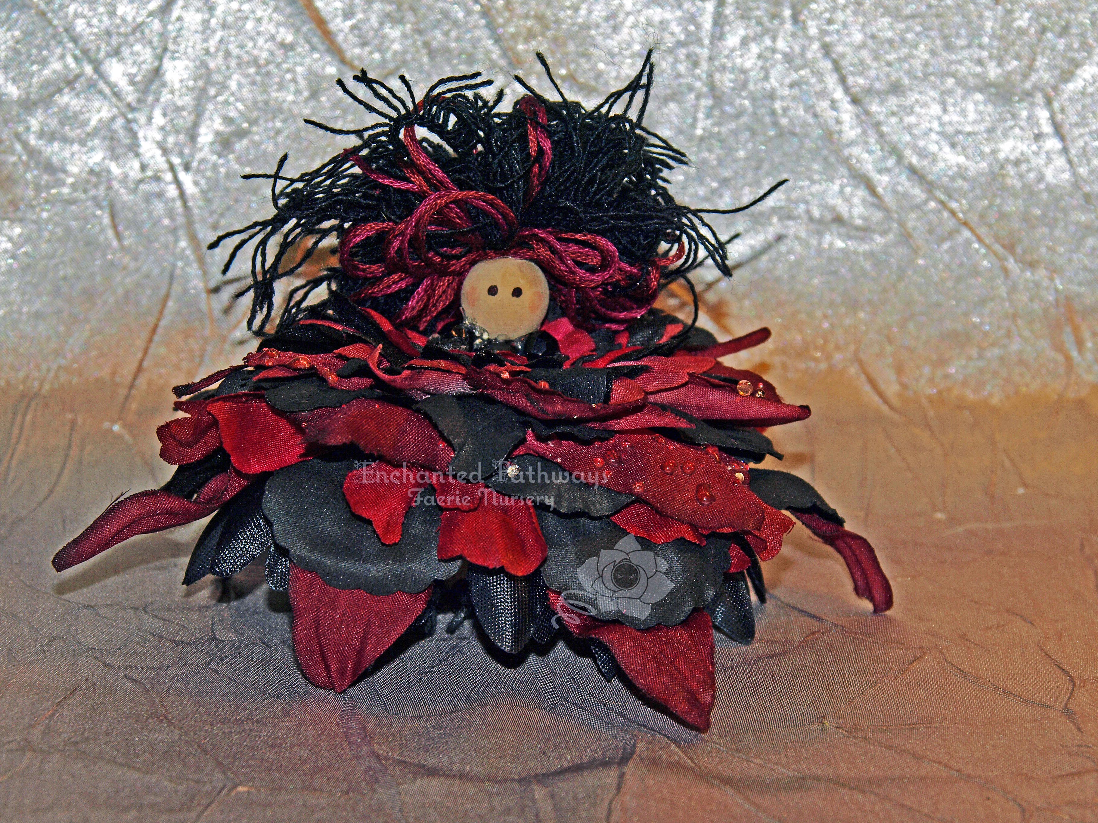 Faerie Catherine's gown looks like it was caught out in the rain as it has magical dew drops sprinkled throughout. Consisting of 18 alternating silk flower petals of black and burgundy, Catherine's gown is just beautiful. She has a black pony bead for a bodice with faceted black beads for sleeves and boots. Her hair is made with black yarn and burgundy floss and it is wildly out of control and you would never know she spent hours upon hours making sure every strand was just in place. She stands at a mere 3.5" from the tips of her toes to the top of her hair.