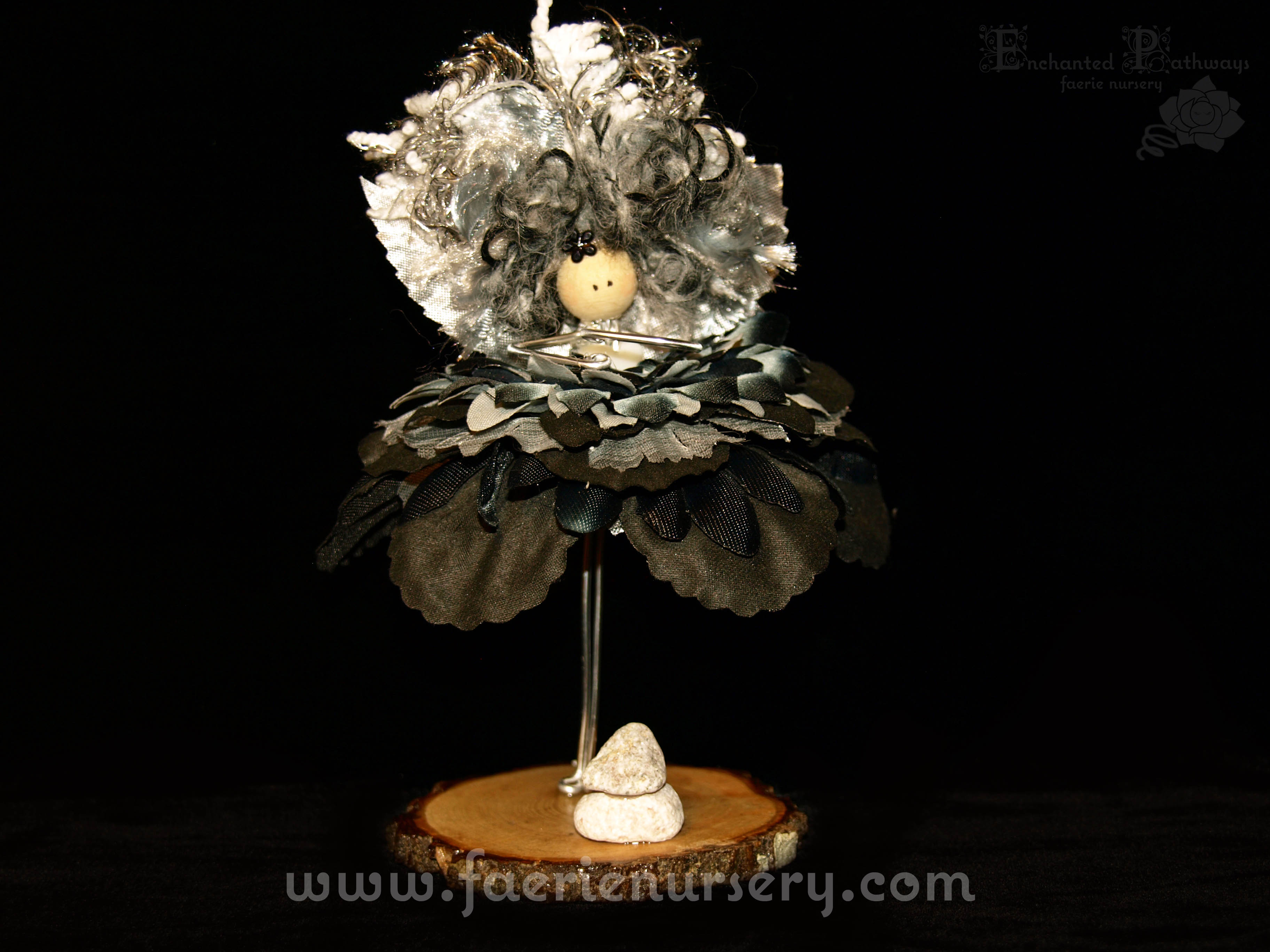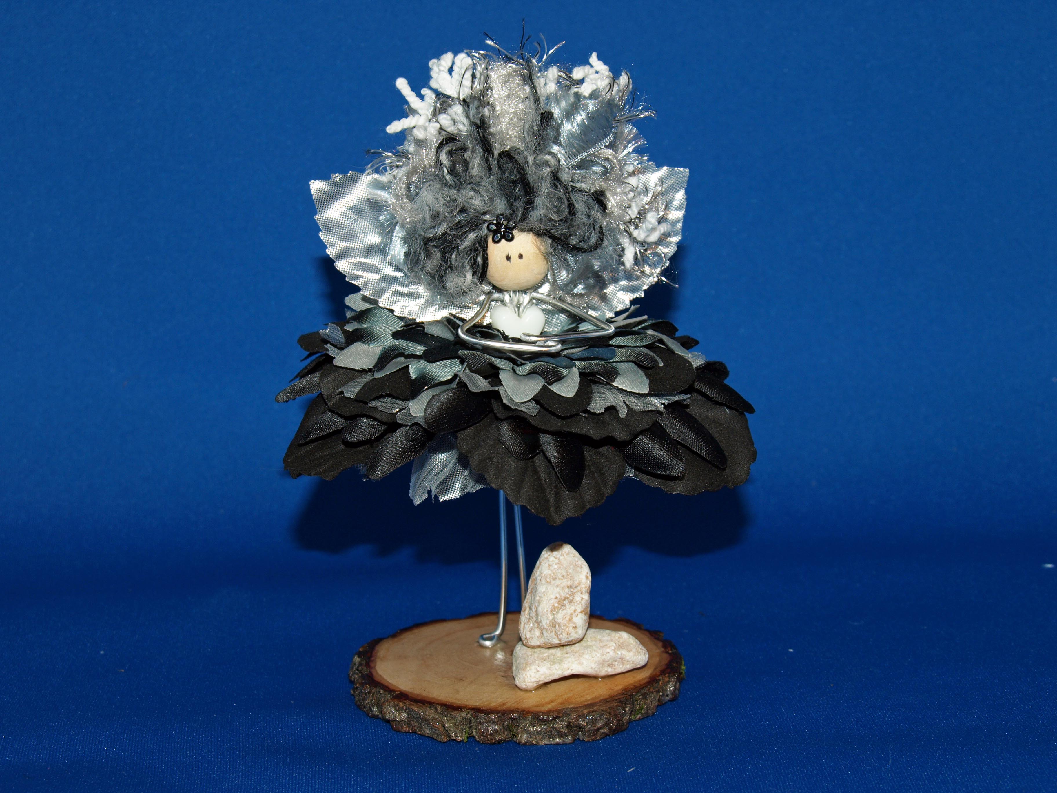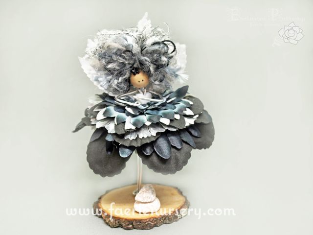 Petra stands just over 5" in height. She has a silver metallic wired body with a white heart shaped pond bead as a bodice. Her dress is made up from 17 layers of alternating black and charcoal silk flower petals with just a hint of silver where the sun shines off as if a fleck of mica was embedded in amongst the dark. Her hair is a mixture of speciality yarns in co-ordinating colours. She has a pair of shiny silver metallic wings to complete the picture.