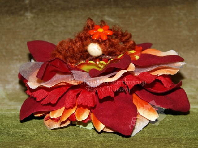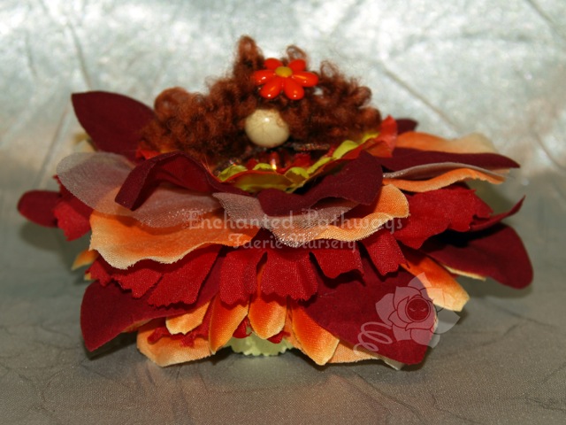 Elie is a teacher, helper and caregiver. She can always be trusted and gives great advice to those she feels need guidance. Elie's gown is made of the richest rust colours almost like the trees at their finest during the Autumn changes. She chose these colours for the beginning of the school season is September, the time of falling leaves from the trees. She has gorgeous reddish orange curly hair with a matching orange and yellow bead flower. Her dress consists of 14 layers of yellow, orange, rust and burgundy coloured flower petals. Faerie Elie stands approximately 2.5" in height.