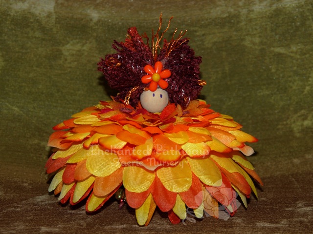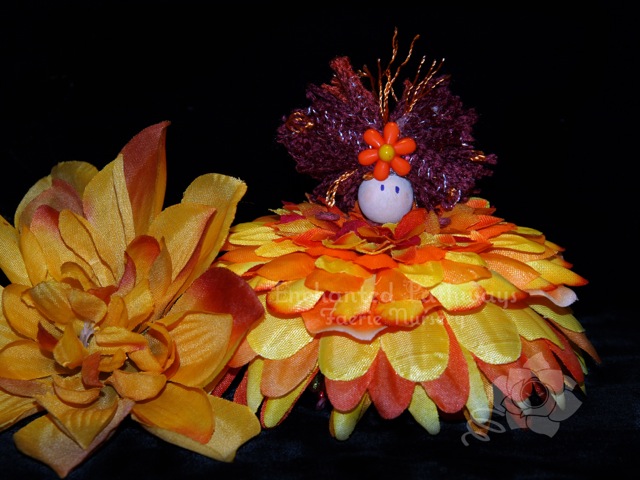 Faerie Suzie has a gown that is made up of 18 layers of silk flower petals. She has a metallic orange coloured pony bead for a bodice and her body is made up wine colour floss wrapped wire. She has beads on her feet and her hair is made of a combination of flosses and yarns that match her dress. She wears a orange and yellow daisy shaped bead in her hair.